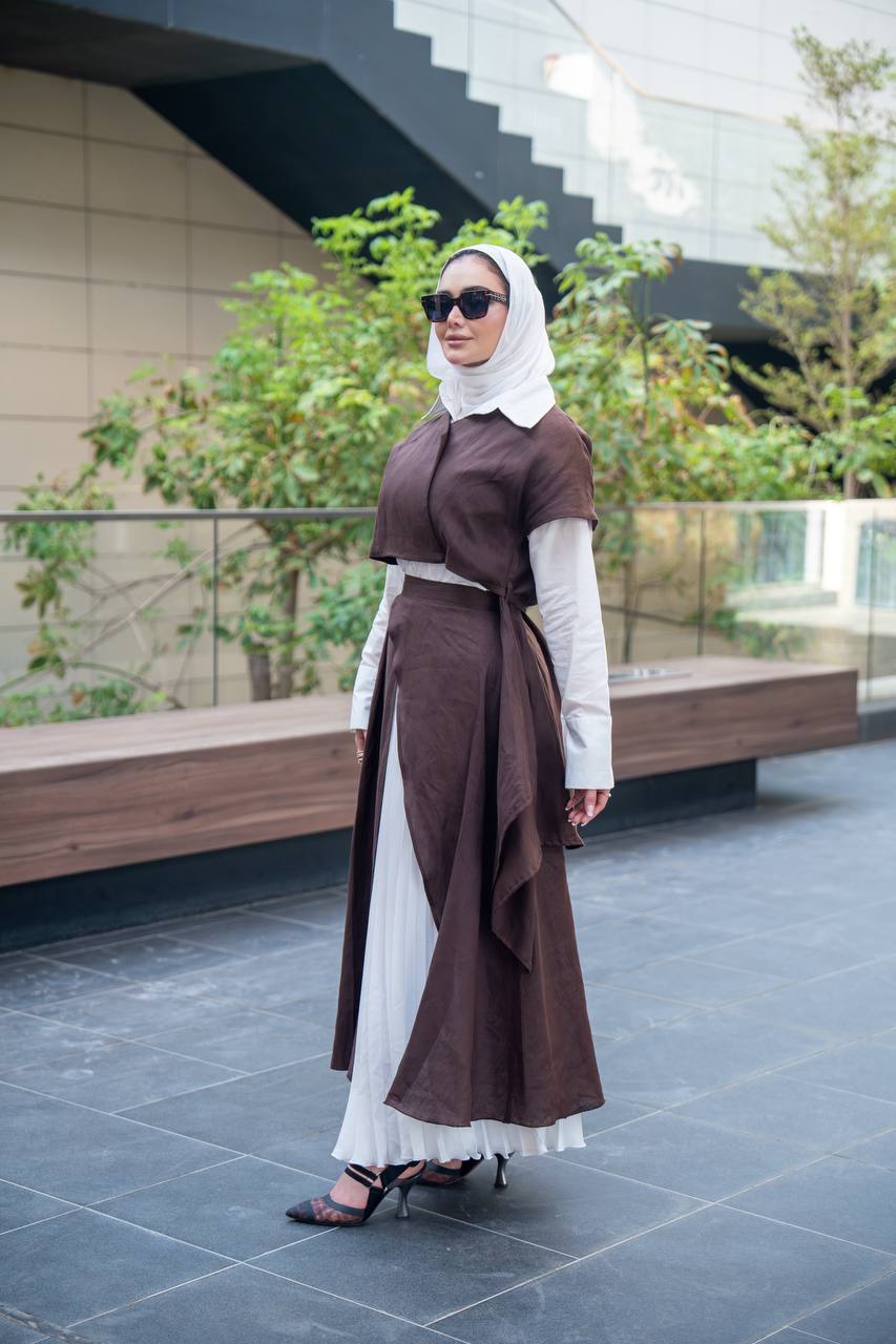 An elegant set that combines elegance and sophistication. It consists of a white shirt and a brown jacket made of luxurious natural linen, with a pleated skirt made of premium crepe. This elegant two-piece set is connected in white and brown, giving you a coordinated and modern look at all times. The set is available in all sizes.