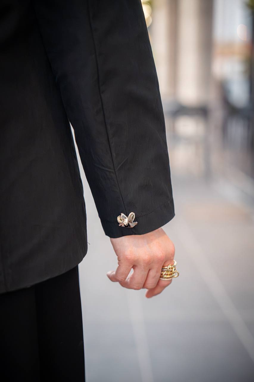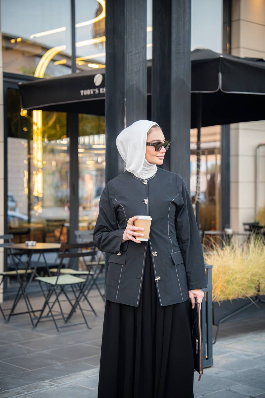 An elegant and practical set consisting of a trench coat jacket and a crepe dress in classic black. The design exudes sophistication and elegance, making it an ideal and essential piece for work, university, and outings. The set is available in all sizes. *Price is for the jacket and dress.