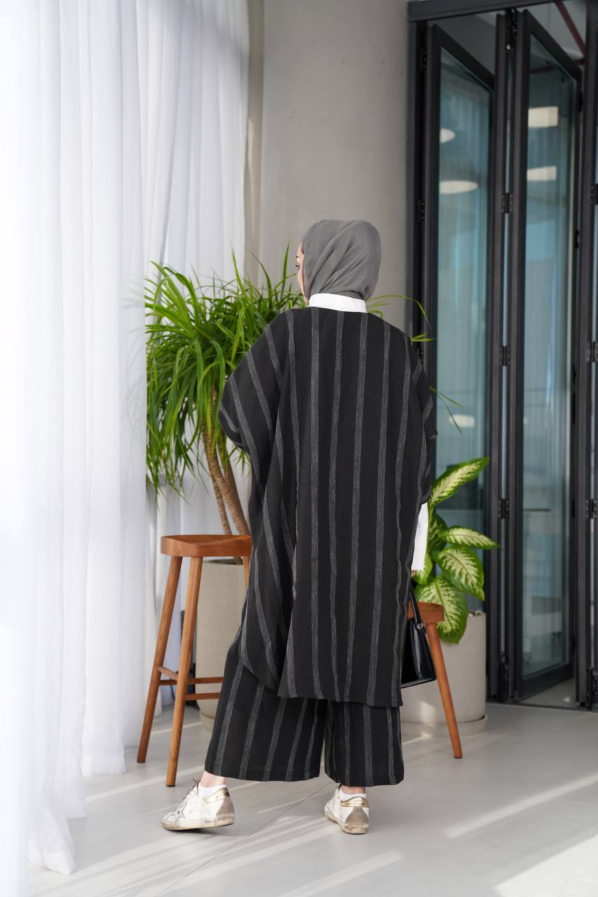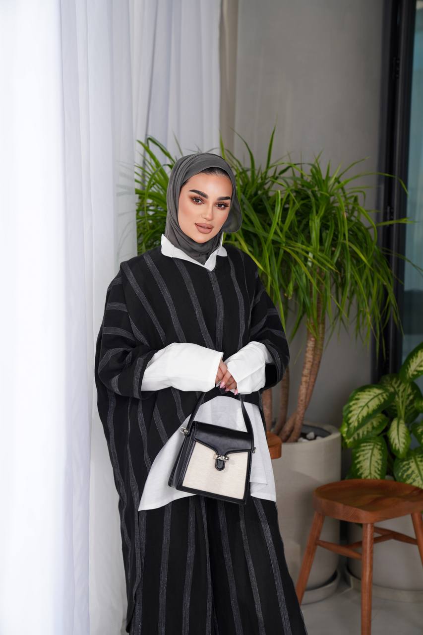 A practical and elegant blouse and pants set made of 100% natural linen raw material, in black with white stripes, with a sophisticated and practical design, making it an ideal choice for trips, outings and all times. The blouse comes in a free size cut, so it is practical and comfortable, and the trousers are available in all sizes. You can choose a white shirt from the interior section of the website to complete your look. (The price is for the blouse and trousers only, the shirt is not included)