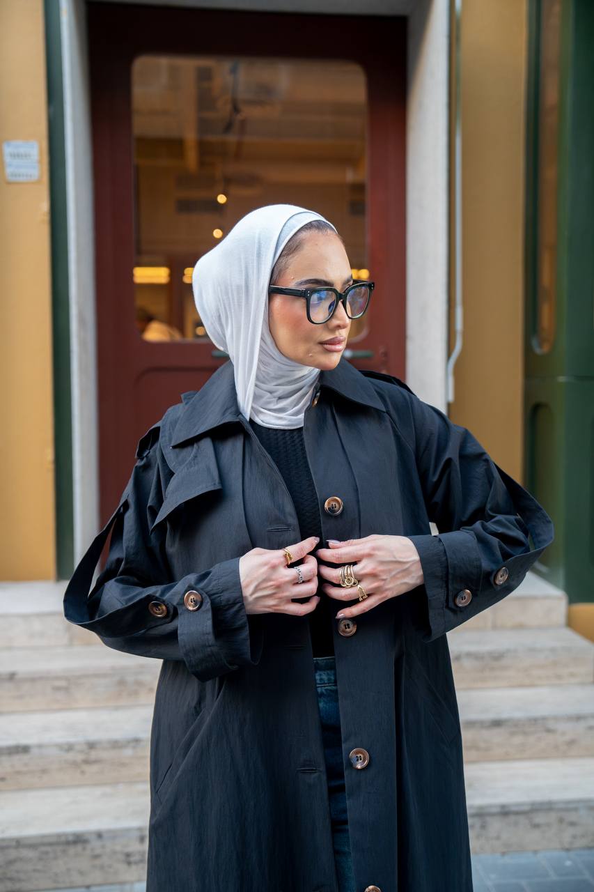 Shine in an elegant look with this black trench coat, featuring a practical yet sophisticated design suitable for work, outings, and university. Available in all sizes and lengths upon request. (Price is for the trench coat only and does not include the undergarment set.)
