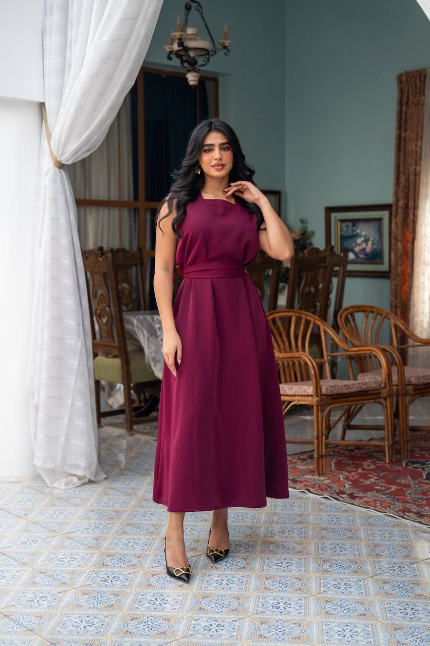 A practical dress made from luxurious crepe fabric in a burgundy color. Available in all sizes and lengths upon request.