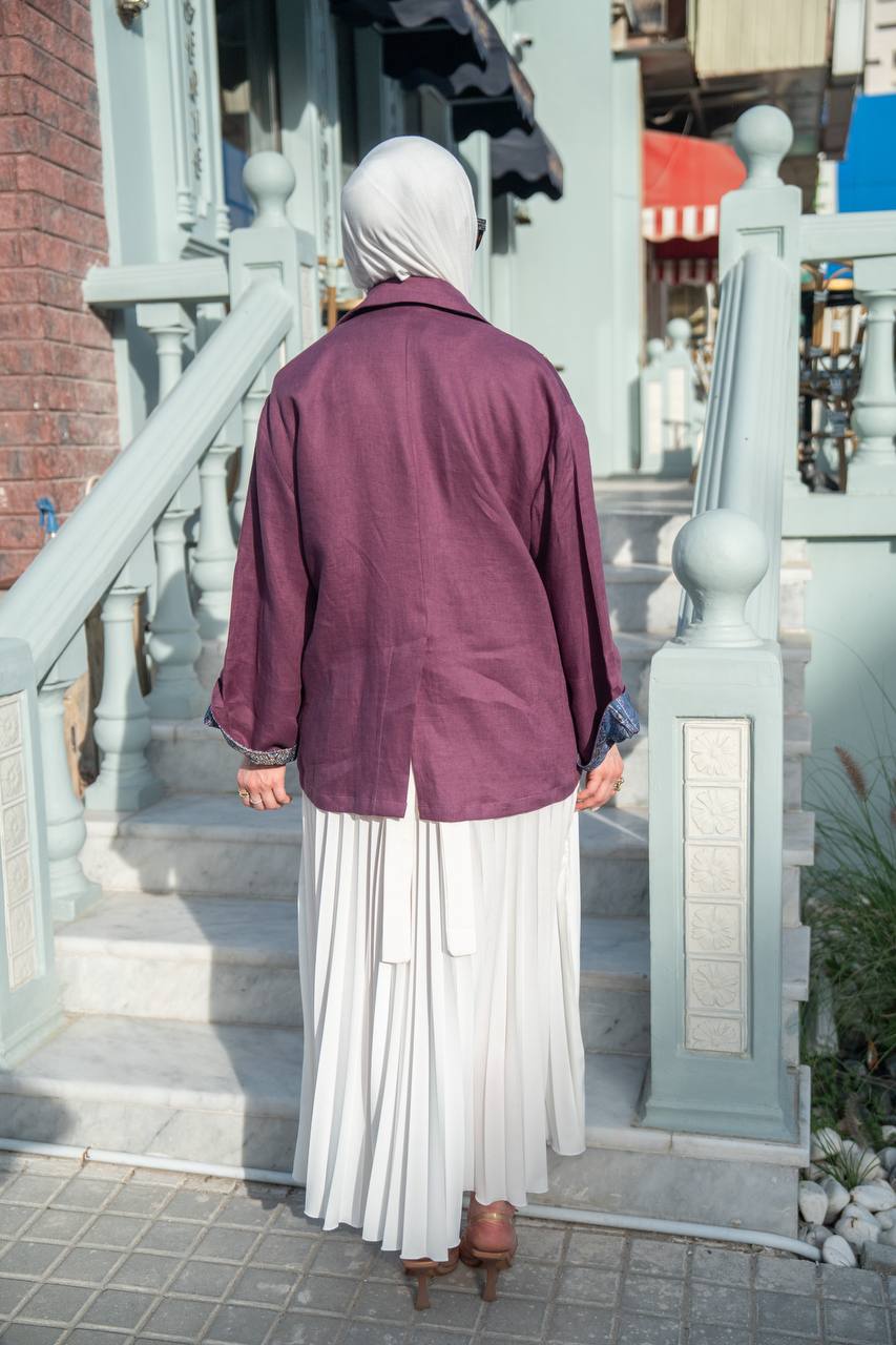 A blazer with a practical yet elegant design, crafted from the finest natural and luxurious linen in a rich burgundy color, adorned with exquisite embroidery that adds a touch of sophistication and modernity. For coordination, you can select the matching undergarment from the website's undergarment section. (Price is for the blazer only and does not include the undergarment.)