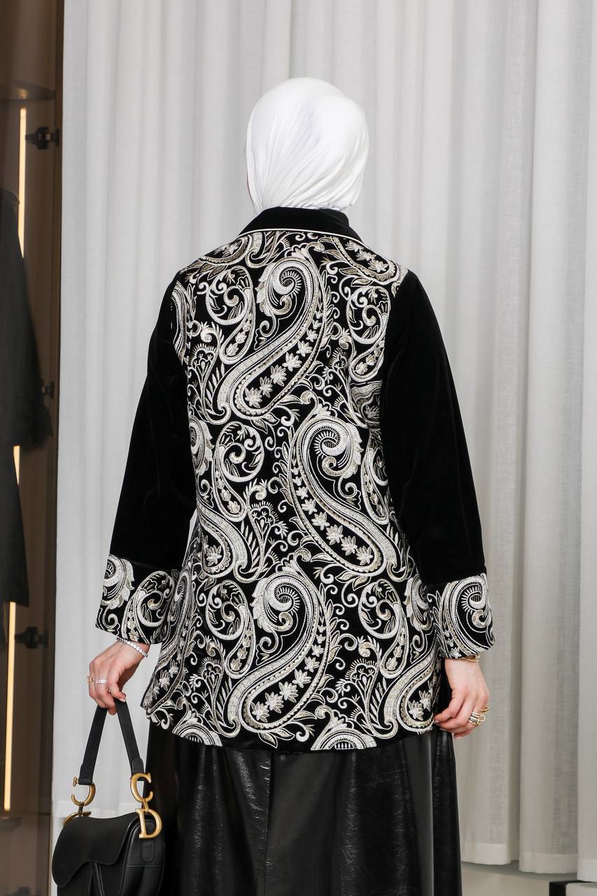 A stylish black set consisting of a leather skirt and a velvet jacket adorned with elegant embroidery, adding a touch of sophistication and modernity to your look. Available in all sizes. (Price is for the skirt and jacket)