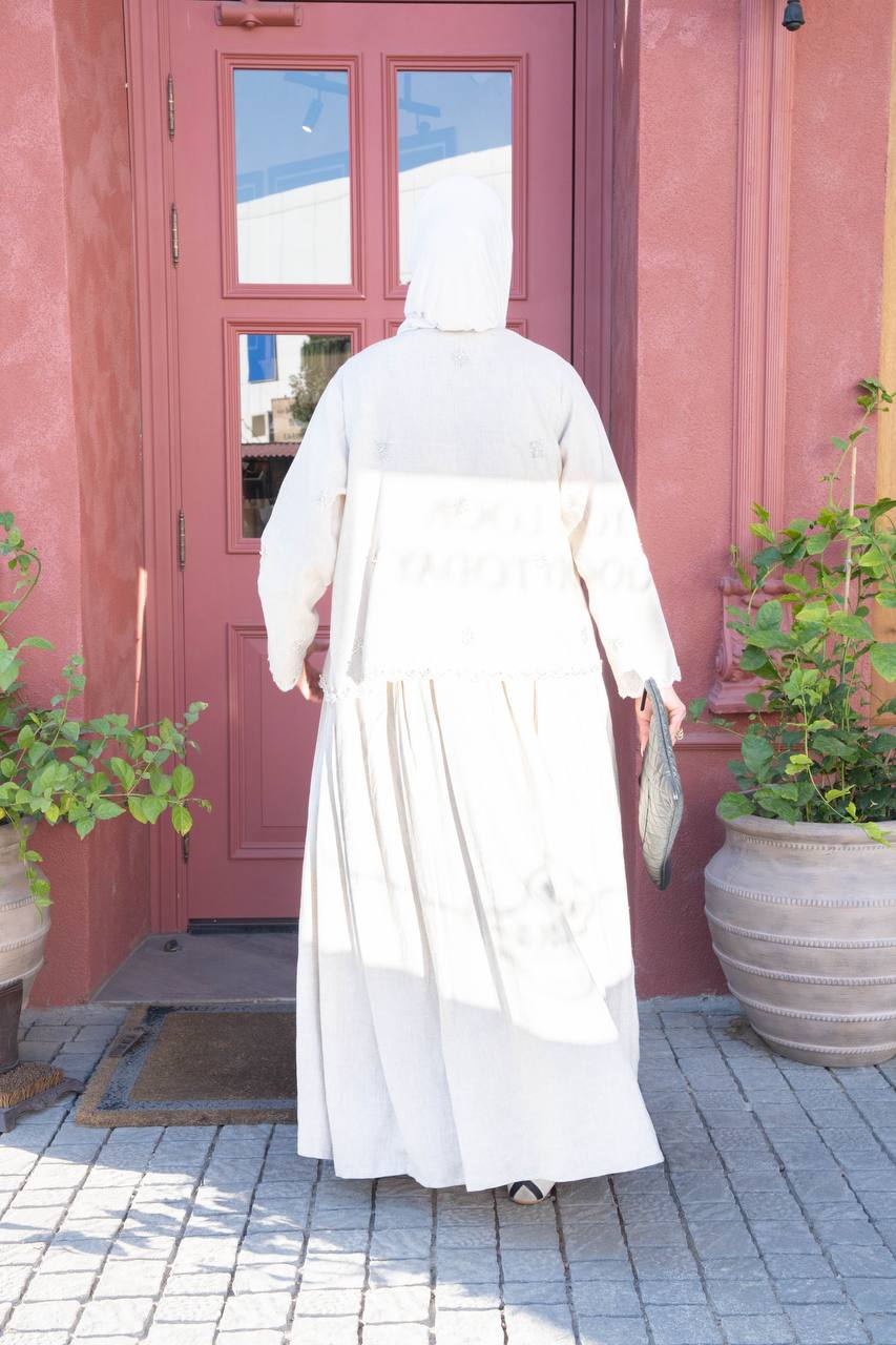 A practical and elegant trench coat in light beige linen with distinctive hand-stitched details. Available in all sizes and lengths upon request. You can choose the matching undergarment from the website's lingerie section. (Price is for the abaya only and does not include the undergarment.)