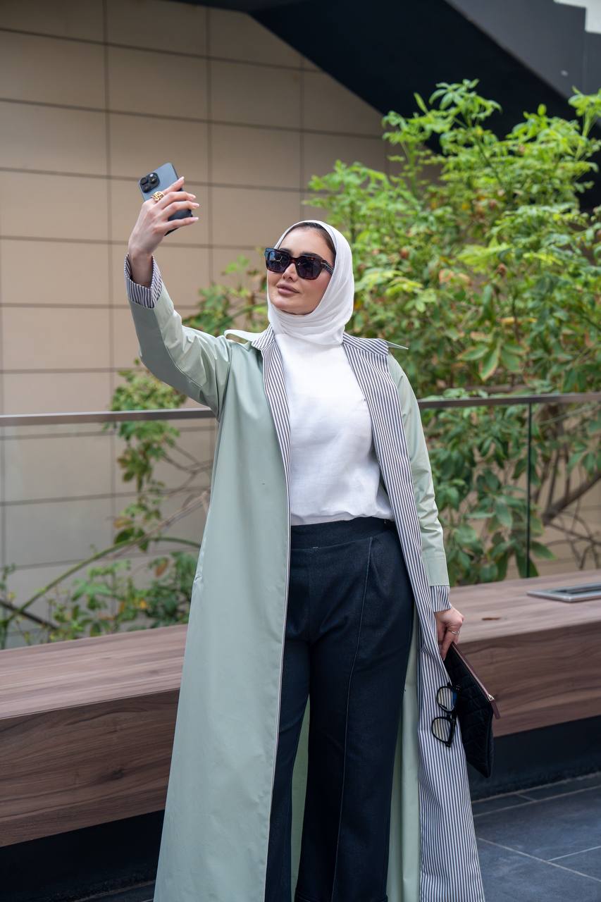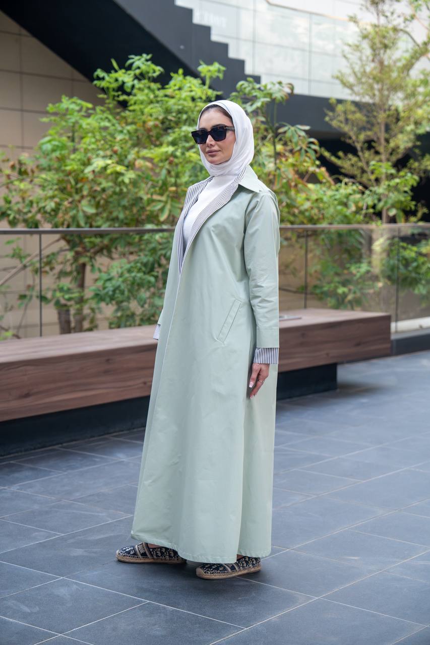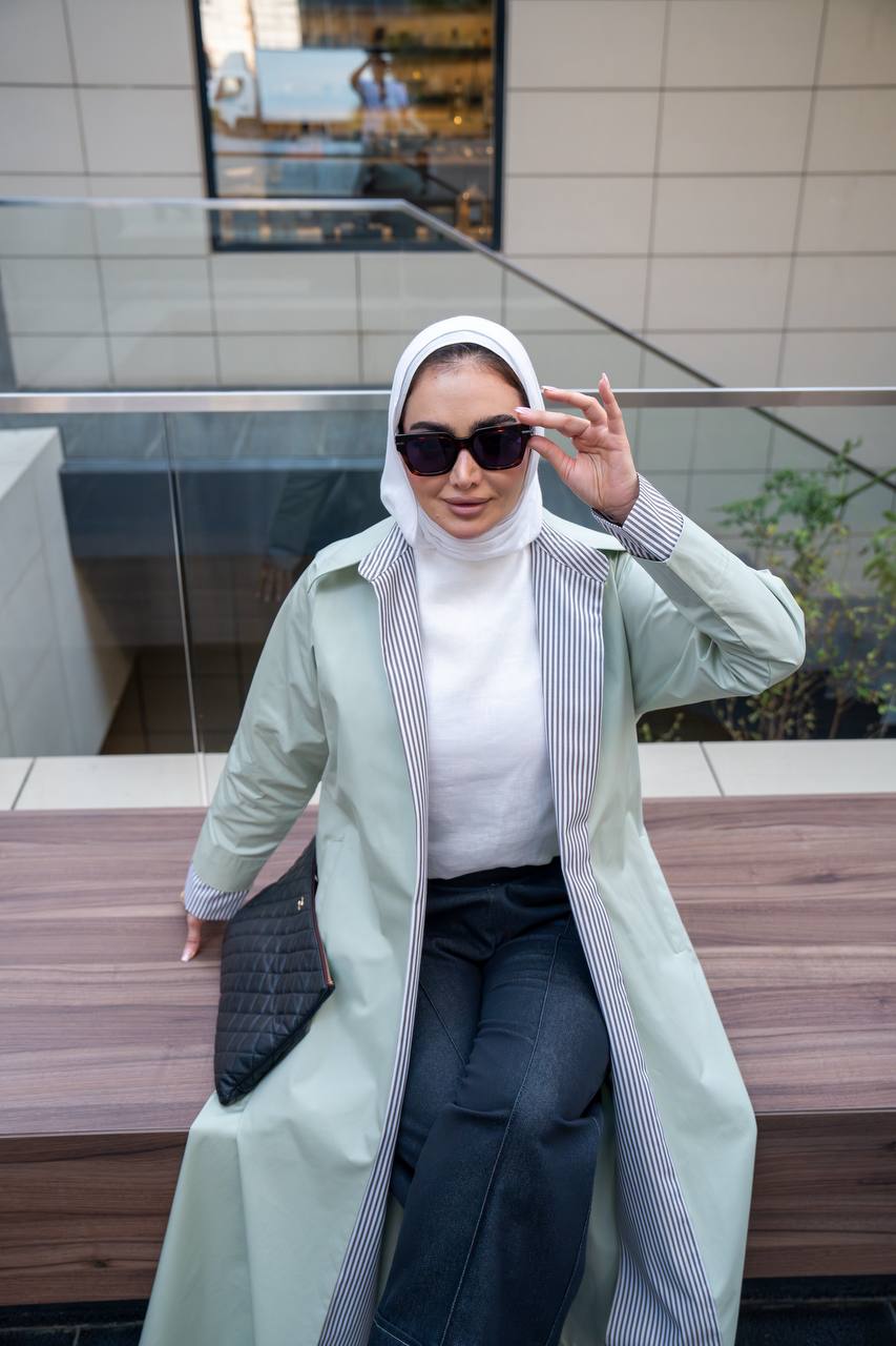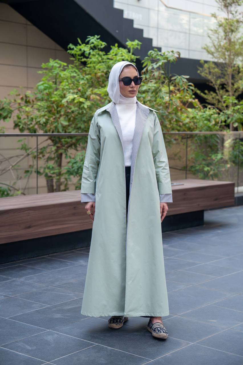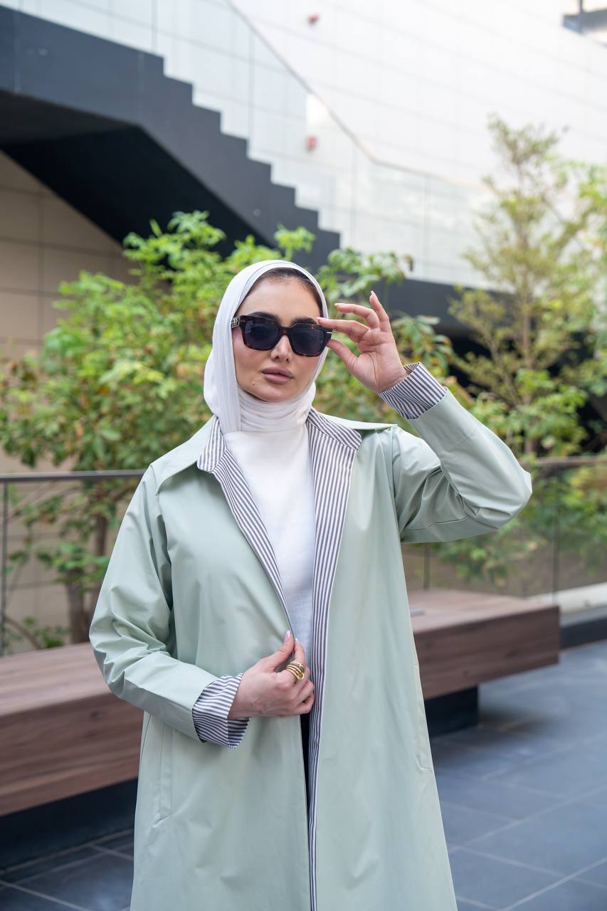 Stand out with a unique look with this elegant and coordinated set consisting of a trench coat in a distinctive light pistachio color, embellished with gray striped details that add a sophisticated, modern touch. The trench coat is coordinated with a blouse and pants, with a design that combines comfort and elegance, giving you a complete look suitable for work, outings, and all occasions. The set is available in all sizes. * Price is for the trench coat, blouse, and pants.