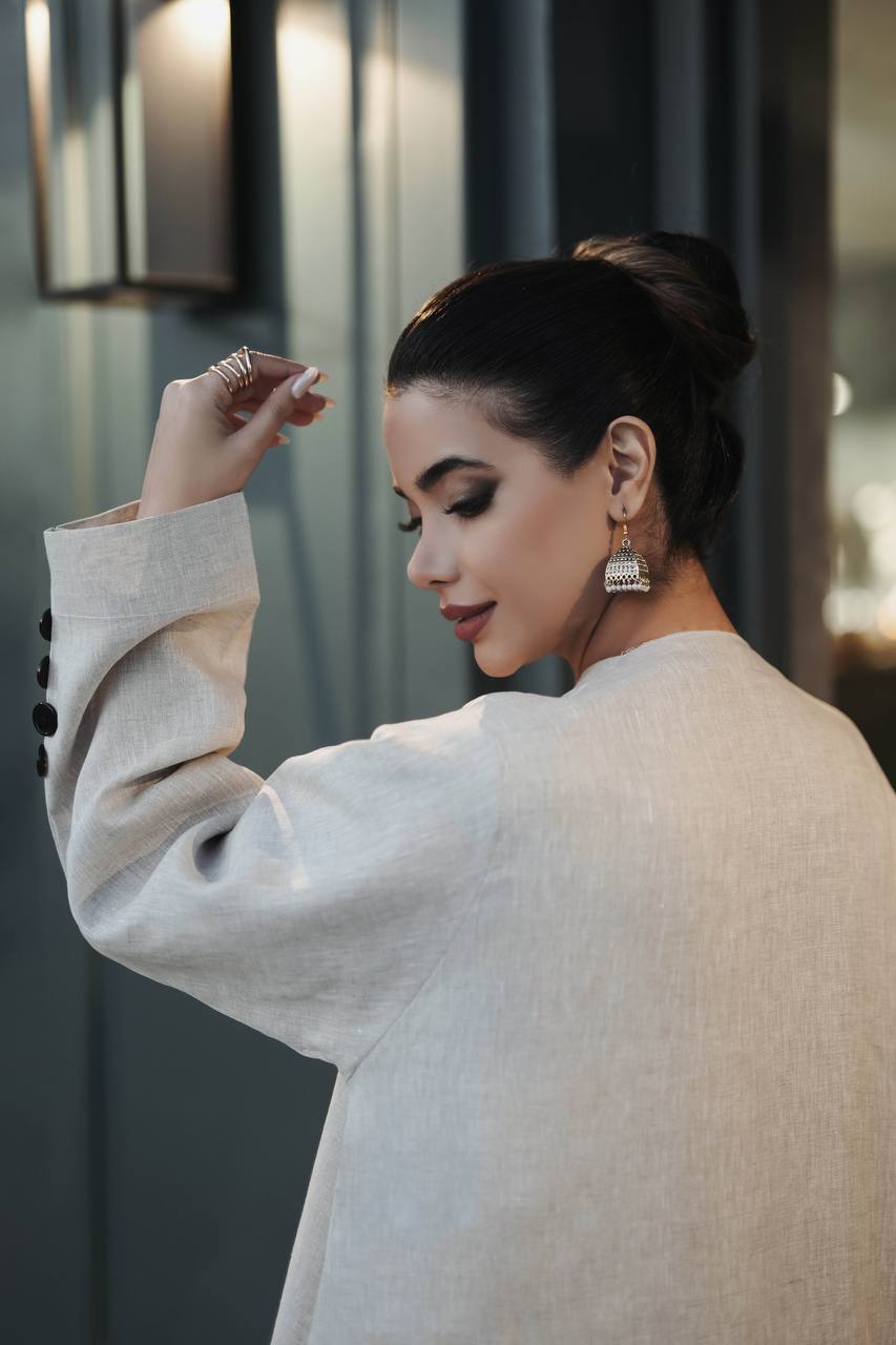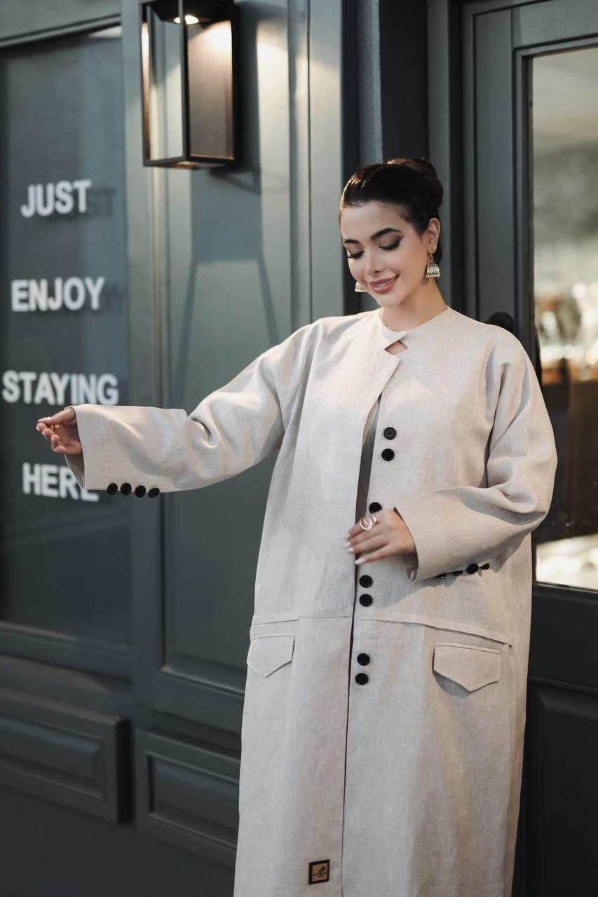 Elevate your attractive look with this elegant vest made of natural linen material in light beige. This abaya is distinguished by its simple, elegant and sophisticated design that suits all tastes, making it an ideal choice for everyone. The vest is available in all sizes and lengths according to your request. You can choose the inner set from the interior section of the website. (The price is for the vest only and does not include the inner set.)