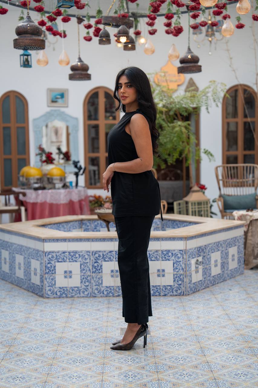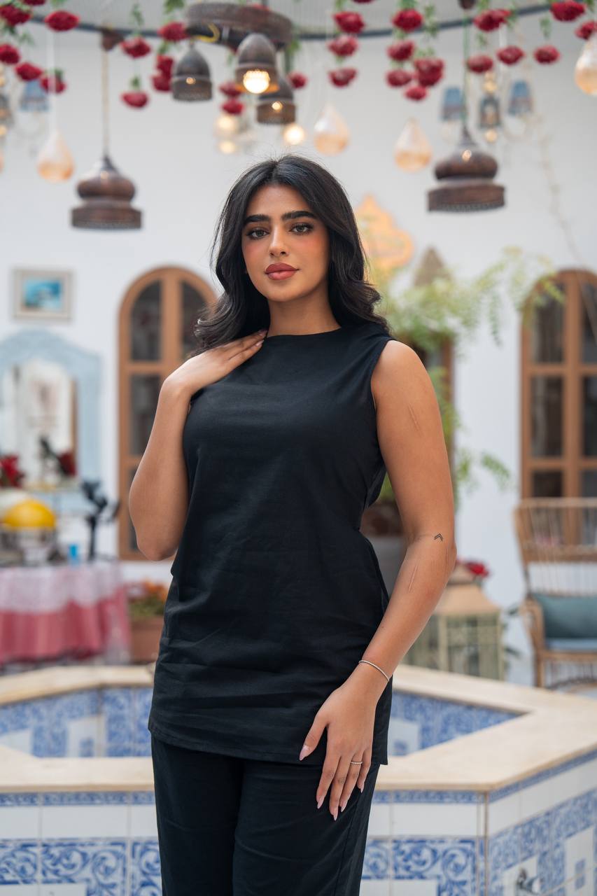 A practical set consisting of a blouse and trousers made from natural linen in black. Available in all sizes.