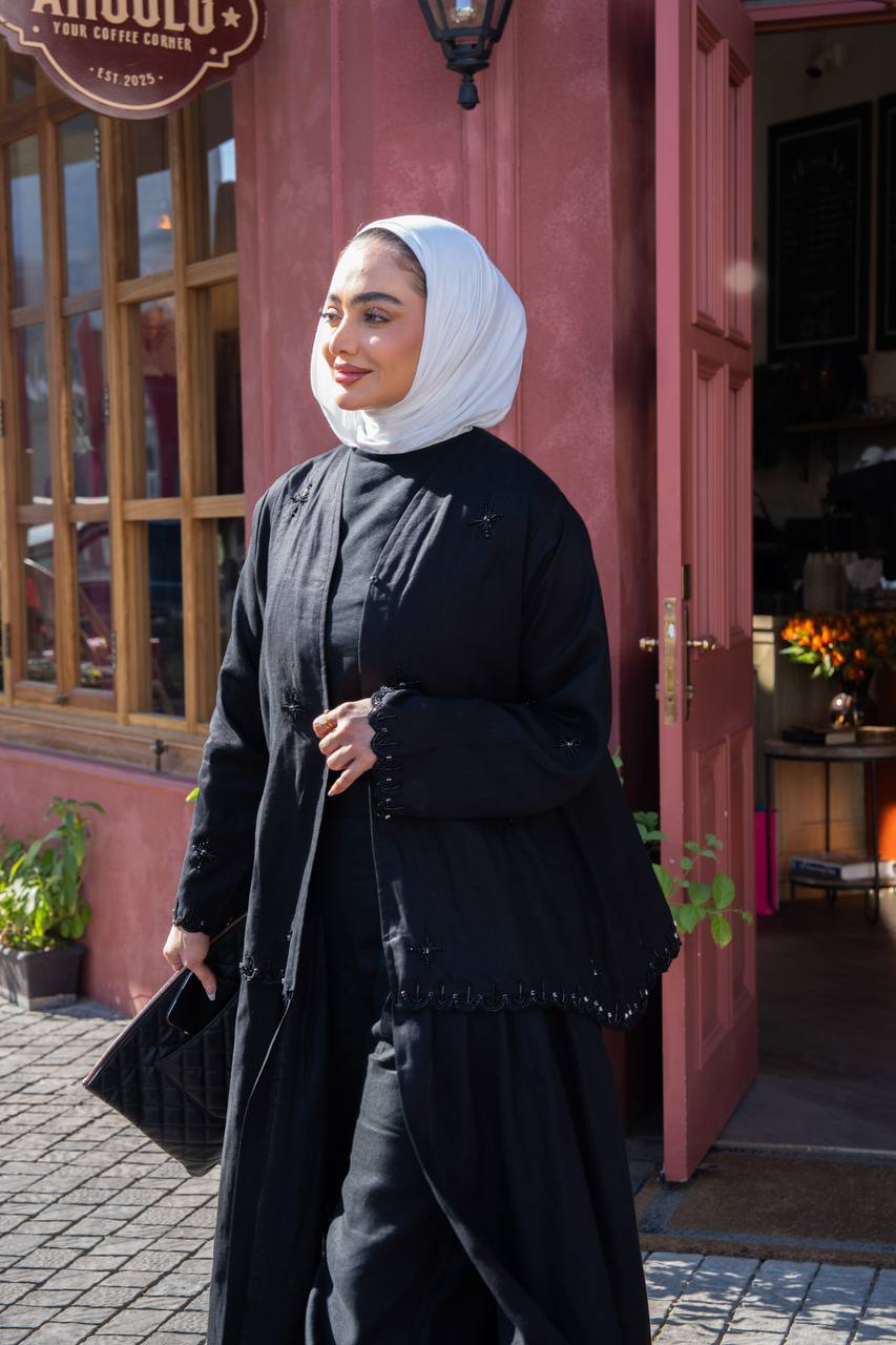 A practical and elegant trench coat in black linen with distinctive hand-stitched details. Available in all sizes and lengths upon request. You can choose the matching undergarment from the website's undergarment section. (Price is for the coat only and does not include the undergarment.)