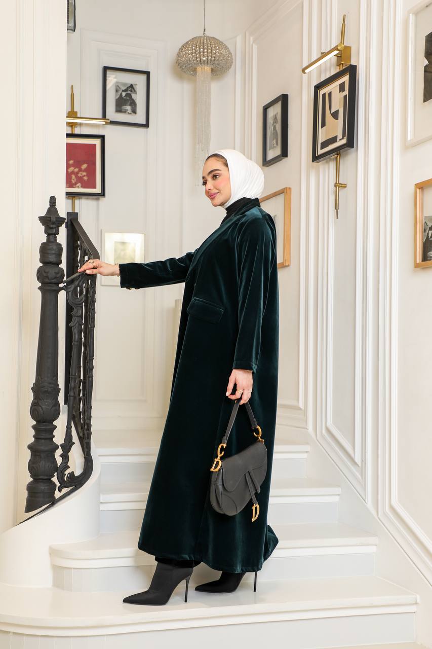 A luxurious velvet blazer in a distinctive petrol color, featuring a design that combines elegance and sophistication, with a comfortable and practical cut suitable for work, outings, and university. Available in all sizes and lengths upon request. (Price is for the blazer only and does not include the inner set.)